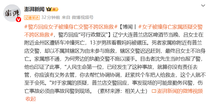 死者家属称隔邻有普兰店交警,却以不属其辖区为由未参与施救,辖区交警迟迟赶到,最终吕女士不治身一火。家属念念欠亨,为何傍边的持勤交警不施以辅助。